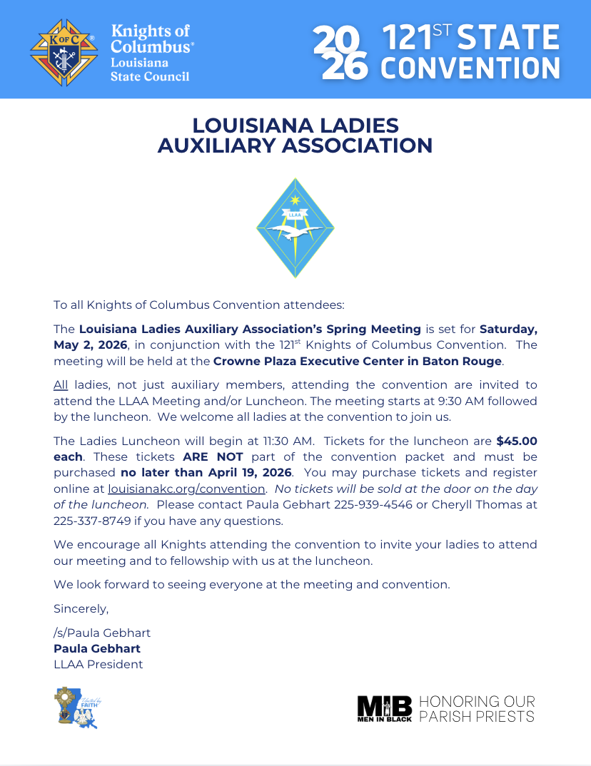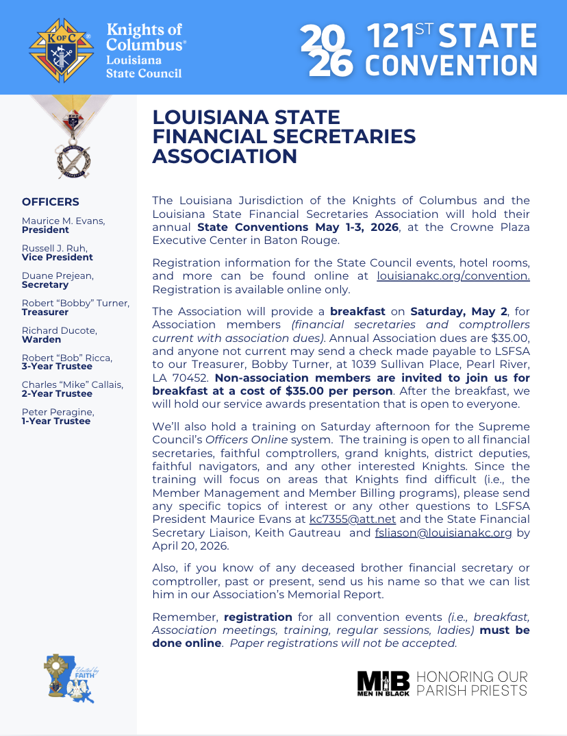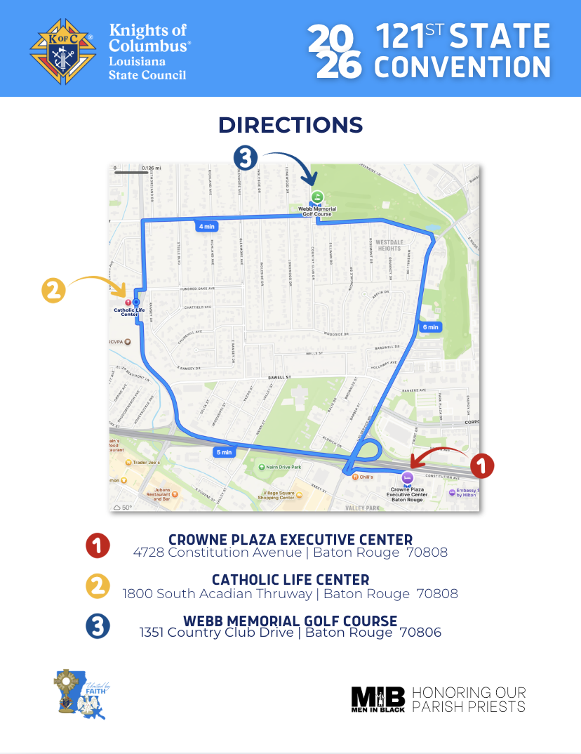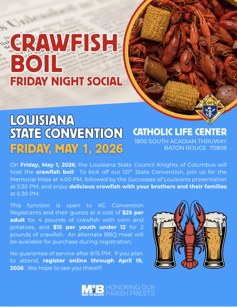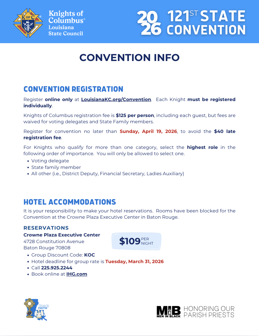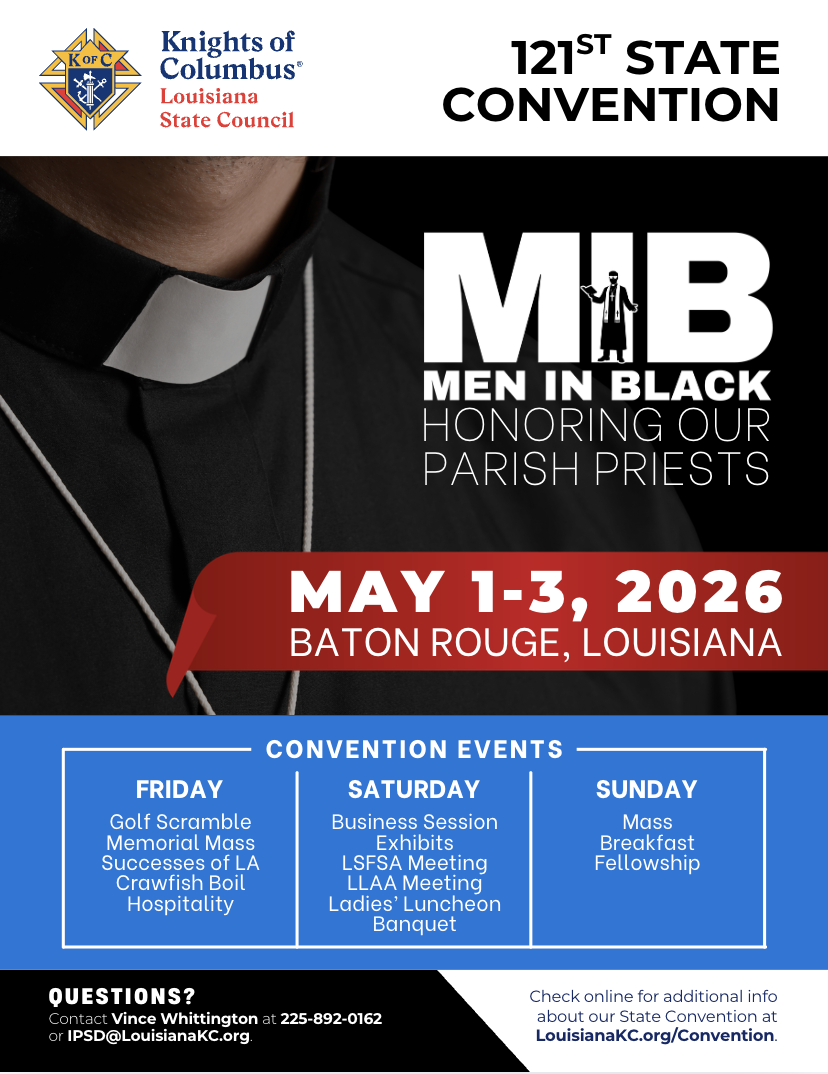 The Louisiana State Convention brings members from all over the state to enjoy a fun, family-filled weekend held in the first weekend of May every year. Attend our Convention and support charitable programs, strengthen your Catholic faith and values, connect with other members and their families, and participate in the business meetings. The Louisiana State Knights of Columbus Convention offers opportunities to engage with the organization's core principles of Faith, Fraternity, and Charity, while fostering a sense of brotherhood among members.