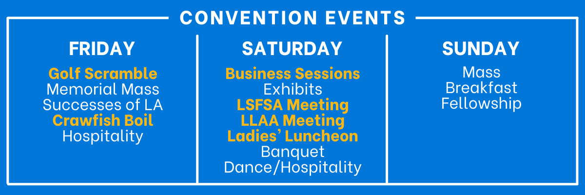 An estimated 500+ people will attend Louisiana's 121st Annual Knights of Columbus State Convention in Baton Rouge, Louisiana, the weekend of May 1-3, 2026. Nearly two-thirds of those attending will come from outside the Baton Rouge area. Don't miss this valuable opportunity to be a part of the celebration by including your council, assembly, auxiliary, company, or services in sponsorship ads and displays during this three-day event.