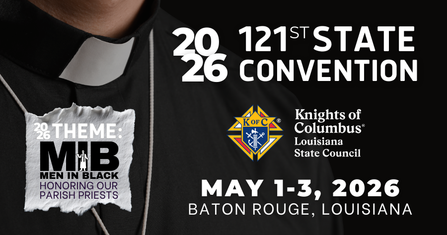 The Louisiana State Convention brings members from all over the state to enjoy a fun, family-friendly weekend in the first weekend of May each year. Attend our Convention and support charitable programs, strengthen your Catholic faith and values, connect with other members and their families, and participate in the business meetings. The Louisiana State Knights of Columbus Convention offers opportunities to engage with the organization's core principles of Faith, Fraternity, and Charity and to foster a sense of brotherhood among members.