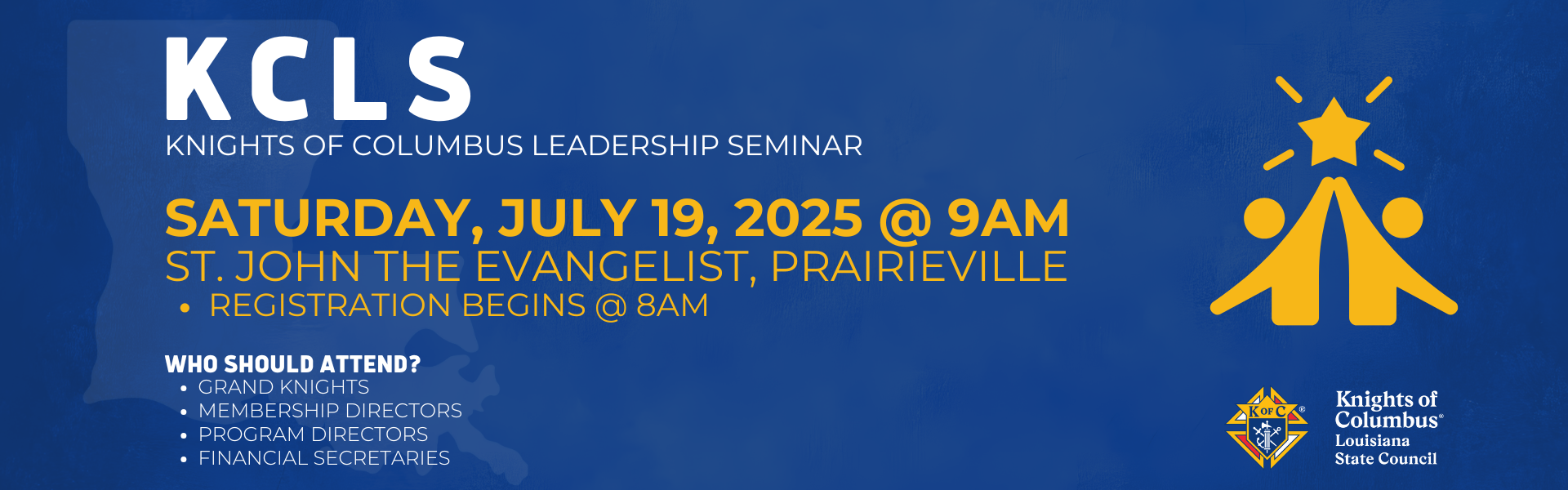 KCLS is a State training seminar held in July to kick off the fraternal year. It may be combined with the District Deputy Organizational Meeting held toward the end of June, so watch for announcements!